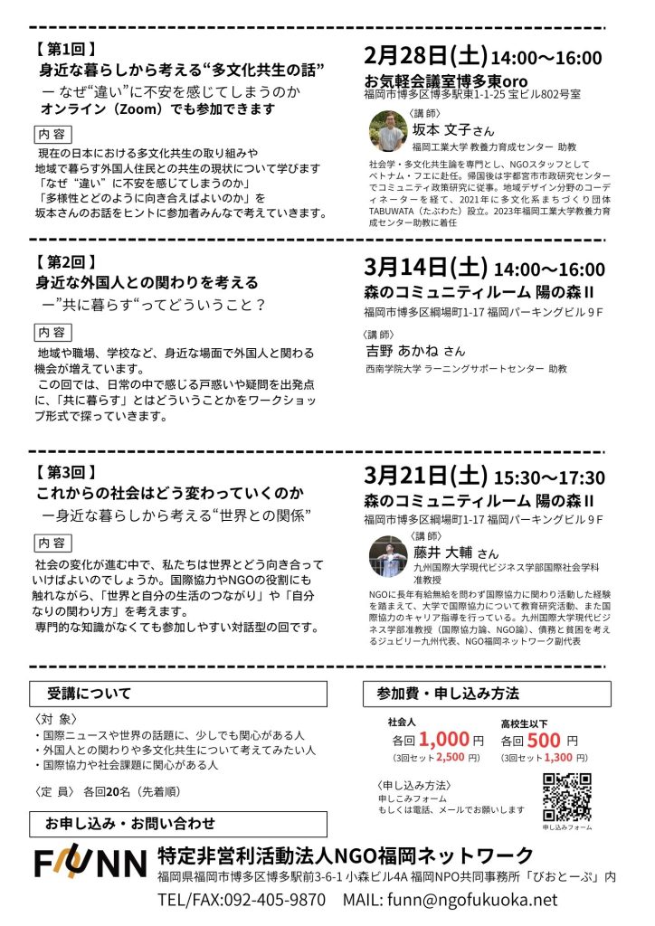 講師には福岡工業大学 教養力育成センター 助教の坂本文子さんをお呼びし、現在の日本における多文化共生の取り組みや地域で暮らす外国人住民との共生の現状について学んでいきます。