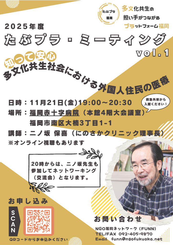 2025年度第1回目のたぶプラミーティングは「外国人住民の医療」をテーマに、にのさかクリニック理事長・二ノ坂保喜先生をお招きし、お話しいただきます。