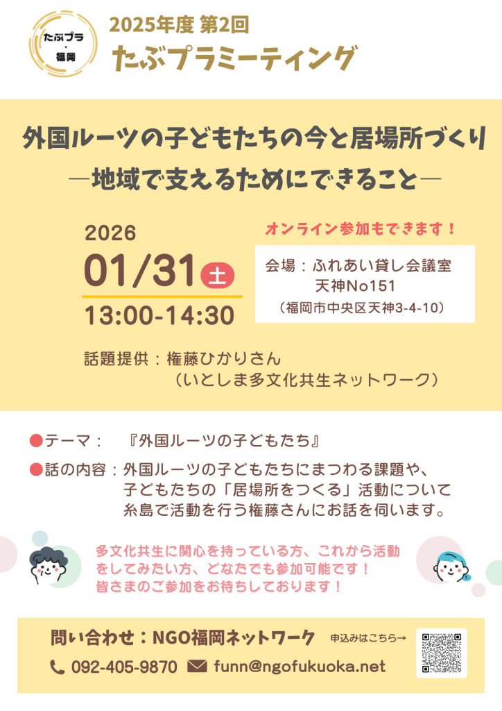 2025年度第2回目のたぶプラミーティングは「外国ルーツの子どもたち」をテーマとし、「いとしま多文化共生ネットワーク」の権藤ひかりさんにお話をしていただきます。